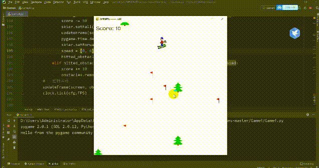 import sysimport cfgimport pygameimport random'''滑雪者类'''class SkierClass(pygame.sprite.Sprite): def __init__(self): pygame.sprite.Sprite.__init__(self)# 滑雪者的朝向(-2到2) self.direction = 0 self.imagepaths = cfg.SKIER_IMAGE_PATHS[:-1] self.image = pygame.image.load(self.imagepaths[self.direction]) self.rect = self.image.get_rect() self.rect.center = [320, 100] self.speed = [self.direction, 6-abs(self.direction)*2]'''改变滑雪者的朝向. 负数为向左,正数为向右,0为向前''' def turn(self, num): self.direction += num self.direction = max(-2, self.direction) self.direction = min(2, self.direction) center = self.rect.center self.image = pygame.image.load(self.imagepaths[self.direction]) self.rect = self.image.get_rect() self.rect.center = center self.speed = [self.direction, 6-abs(self.direction)*2]return self.speed'''移动滑雪者''' def move(self): self.rect.centerx += self.speed[0] self.rect.centerx = max(20, self.rect.centerx) self.rect.centerx = min(620, self.rect.centerx)'''设置为摔倒状态''' def setFall(self): self.image = pygame.image.load(cfg.SKIER_IMAGE_PATHS[-1])'''设置为站立状态''' def setForward(self): self.direction = 0 self.image = pygame.image.load(self.imagepaths[self.direction])'''Function: 障碍物类Input: img_path: 障碍物图片路径 location: 障碍物位置 attribute: 障碍物类别属性'''class ObstacleClass(pygame.sprite.Sprite): def __init__(self, img_path, location, attribute): pygame.sprite.Sprite.__init__(self) self.img_path = img_path self.image = pygame.image.load(self.img_path) self.location = location self.rect = self.image.get_rect() self.rect.center = self.location self.attribute = attribute self.passed = False'''移动''' def move(self, num): self.rect.centery = self.location[1] - num'''创建障碍物'''def createObstacles(s, e, num=10): obstacles = pygame.sprite.Group() locations = []for i in range(num): row = random.randint(s, e) col = random.randint(0, 9) location = [col*64+20, row*64+20]if location not in locations: locations.append(location) attribute = random.choice(list(cfg.OBSTACLE_PATHS.keys())) img_path = cfg.OBSTACLE_PATHS[attribute] obstacle = ObstacleClass(img_path, location, attribute) obstacles.add(obstacle)return obstacles'''合并障碍物'''def AddObstacles(obstacles0, obstacles1): obstacles = pygame.sprite.Group()for obstacle in obstacles0: obstacles.add(obstacle)for obstacle in obstacles1: obstacles.add(obstacle)return obstacles'''显示游戏开始界面'''def ShowStartInterface(screen, screensize): screen.fill((255, 255, 255)) tfont = pygame.font.Font(cfg.FONTPATH, screensize[0]//5) cfont = pygame.font.Font(cfg.FONTPATH, screensize[0]//20) title = tfont.render(u'滑雪游戏', True, (255, 0, 0)) content = cfont.render(u'按任意键开始游戏', True, (0, 0, 255)) trect = title.get_rect() trect.midtop = (screensize[0]/2, screensize[1]/5) crect = content.get_rect() crect.midtop = (screensize[0]/2, screensize[1]/2) screen.blit(title, trect) screen.blit(content, crect)while True:for event in pygame.event.get():if event.type == pygame.QUIT: pygame.quit() sys.exit()elif event.type == pygame.KEYDOWN:return pygame.display.update()'''显示分数'''def showScore(screen, score, pos=(10, 10)): font = pygame.font.Font(cfg.FONTPATH, 30) score_text = font.render(Score: %s % score, True, (0, 0, 0)) screen.blit(score_text, pos)'''更新当前帧的游戏画面'''def updateFrame(screen, obstacles, skier, score): screen.fill((255, 255, 255)) obstacles.draw(screen) screen.blit(skier.image, skier.rect) showScore(screen, score) pygame.display.update()'''主程序'''def main():# 游戏初始化 pygame.init() pygame.mixer.init() pygame.mixer.music.load(cfg.BGMPATH) pygame.mixer.music.set_volume(0.4) pygame.mixer.music.play(-1)# 设置屏幕 screen = pygame.display.set_mode(cfg.SCREENSIZE) pygame.display.set_caption('滑雪游戏 —— 九歌')# 游戏开始界面 ShowStartInterface(screen, cfg.SCREENSIZE)# 实例化游戏精灵# --滑雪者 skier = SkierClass()# --创建障碍物 obstacles0 = createObstacles(20, 29) obstacles1 = createObstacles(10, 19) obstaclesflag = 0 obstacles = AddObstacles(obstacles0, obstacles1)# 游戏clock clock = pygame.time.Clock()# 记录滑雪的距离 distance = 0# 记录当前的分数 score = 0# 记录当前的速度 speed = [0, 6]# 游戏主循环while True:# --事件捕获for event in pygame.event.get():if event.type == pygame.QUIT: pygame.quit() sys.exit()if event.type == pygame.KEYDOWN:if event.key == pygame.K_LEFT or event.key == pygame.K_a: speed = skier.turn(-1)elif event.key == pygame.K_RIGHT or event.key == pygame.K_d: speed = skier.turn(1)# --更新当前游戏帧的数据 skier.move() distance += speed[1]if distance >= 640 and obstaclesflag == 0: obstaclesflag = 1 obstacles0 = createObstacles(20, 29) obstacles = AddObstacles(obstacles0, obstacles1)if distance >= 1280 and obstaclesflag == 1: obstaclesflag = 0 distance -= 1280for obstacle in obstacles0: obstacle.location[1] = obstacle.location[1] - 1280 obstacles1 = createObstacles(10, 19) obstacles = AddObstacles(obstacles0, obstacles1)for obstacle in obstacles: obstacle.move(distance)# --碰撞检测 hitted_obstacles = pygame.sprite.spritecollide(skier, obstacles, False)if hitted_obstacles:if hitted_obstacles[0].attribute == tree and not hitted_obstacles[0].passed: score -= 50 skier.setFall() updateFrame(screen, obstacles, skier, score) pygame.time.delay(1000) skier.setForward() speed = [0, 6] hitted_obstacles[0].passed = Trueelif hitted_obstacles[0].attribute == flag and not hitted_obstacles[0].passed: score += 10 obstacles.remove(hitted_obstacles[0])# --更新屏幕 updateFrame(screen, obstacles, skier, score) clock.tick(cfg.FPS)'''run'''if __name__ == '__main__': main();