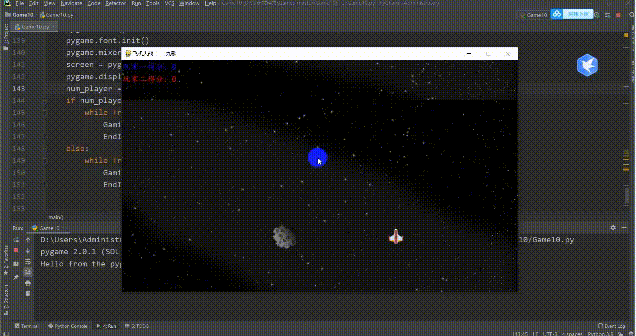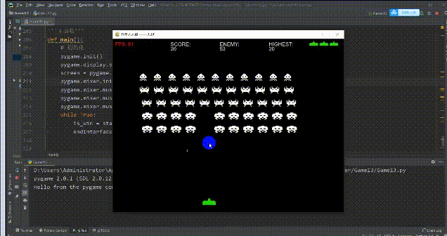 import sysimport cfgimport pygamefrom modules import *'''游戏界面'''def GamingInterface(num_player, screen):# 初始化 pygame.mixer.music.load(cfg.SOUNDPATHS['Cool Space Music']) pygame.mixer.music.set_volume(0.4) pygame.mixer.music.play(-1) explosion_sound = pygame.mixer.Sound(cfg.SOUNDPATHS['boom']) fire_sound = pygame.mixer.Sound(cfg.SOUNDPATHS['shot']) font = pygame.font.Font(cfg.FONTPATH, 20)# 游戏背景图 bg_imgs = [cfg.IMAGEPATHS['bg_big'], cfg.IMAGEPATHS['seamless_space'], cfg.IMAGEPATHS['space3']] bg_move_dis = 0 bg_1 = pygame.image.load(bg_imgs[0]).convert() bg_2 = pygame.image.load(bg_imgs[1]).convert() bg_3 = pygame.image.load(bg_imgs[2]).convert()# 玩家, 子弹和小行星精灵组 player_group = pygame.sprite.Group() bullet_group = pygame.sprite.Group() asteroid_group = pygame.sprite.Group()# 产生小行星的时间间隔 asteroid_ticks = 90for i in range(num_player): player_group.add(Ship(i+1, cfg)) clock = pygame.time.Clock()# 分数 score_1, score_2 = 0, 0# 游戏主循环while True:for event in pygame.event.get():if event.type == pygame.QUIT: pygame.quit() sys.exit()# --玩家一: ↑↓←→控制, j射击; 玩家二: wsad控制, 空格射击 pressed_keys = pygame.key.get_pressed()for idx, player in enumerate(player_group): direction = Noneif idx == 0:if pressed_keys[pygame.K_UP]: direction = 'up'elif pressed_keys[pygame.K_DOWN]: direction = 'down'elif pressed_keys[pygame.K_LEFT]: direction = 'left'elif pressed_keys[pygame.K_RIGHT]: direction = 'right'if direction: player.move(direction)if pressed_keys[pygame.K_j]:if player.cooling_time == 0: fire_sound.play() bullet_group.add(player.shot()) player.cooling_time = 20elif idx == 1:if pressed_keys[pygame.K_w]: direction = 'up'elif pressed_keys[pygame.K_s]: direction = 'down'elif pressed_keys[pygame.K_a]: direction = 'left'elif pressed_keys[pygame.K_d]: direction = 'right'if direction: player.move(direction)if pressed_keys[pygame.K_SPACE]:if player.cooling_time == 0: fire_sound.play() bullet_group.add(player.shot()) player.cooling_time = 20if player.cooling_time > 0: player.cooling_time -= 1if (score_1 + score_2) < 500: background = bg_1elif (score_1 + score_2) < 1500: background = bg_2else: background = bg_3# --向下移动背景图实现飞船向上移动的效果 screen.blit(background, (0, -background.get_rect().height + bg_move_dis)) screen.blit(background, (0, bg_move_dis)) bg_move_dis = (bg_move_dis + 2) % background.get_rect().height# --生成小行星if asteroid_ticks == 0: asteroid_ticks = 90 asteroid_group.add(Asteroid(cfg))else: asteroid_ticks -= 1# --画飞船for player in player_group:if pygame.sprite.spritecollide(player, asteroid_group, True, None): player.explode_step = 1 explosion_sound.play()elif player.explode_step > 0:if player.explode_step > 3: player_group.remove(player)if len(player_group) == 0:returnelse: player.explode(screen)else: player.draw(screen)# --画子弹for bullet in bullet_group: bullet.move()if pygame.sprite.spritecollide(bullet, asteroid_group, True, None): bullet_group.remove(bullet)if bullet.player_idx == 1: score_1 += 1else: score_2 += 1else: bullet.draw(screen)# --画小行星for asteroid in asteroid_group: asteroid.move() asteroid.rotate() asteroid.draw(screen)# --显示分数 score_1_text = '玩家一得分: %s' % score_1 score_2_text = '玩家二得分: %s' % score_2 text_1 = font.render(score_1_text, True, (0, 0, 255)) text_2 = font.render(score_2_text, True, (255, 0, 0)) screen.blit(text_1, (2, 5)) screen.blit(text_2, (2, 35))# --屏幕刷新 pygame.display.update() clock.tick(60)'''主函数'''def main(): pygame.init() pygame.font.init() pygame.mixer.init() screen = pygame.display.set_mode(cfg.SCREENSIZE) pygame.display.set_caption('飞机大战 —— 九歌') num_player = StartInterface(screen, cfg)if num_player == 1:while True: GamingInterface(num_player=1, screen=screen) EndInterface(screen, cfg)else:while True: GamingInterface(num_player=2, screen=screen) EndInterface(screen, cfg)'''run'''if __name__ == '__main__': main()