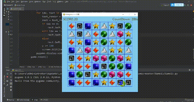 import osimport sysimport cfgimport pygamefrom modules import *'''游戏主程序'''def main(): pygame.init() screen = pygame.display.set_mode(cfg.SCREENSIZE) pygame.display.set_caption('Gemgem —— 九歌')# 加载背景音乐 pygame.mixer.init() pygame.mixer.music.load(os.path.join(cfg.ROOTDIR, resources/audios/bg.mp3)) pygame.mixer.music.set_volume(0.6) pygame.mixer.music.play(-1)# 加载音效 sounds = {} sounds['mismatch'] = pygame.mixer.Sound(os.path.join(cfg.ROOTDIR, 'resources/audios/badswap.wav')) sounds['match'] = []for i in range(6): sounds['match'].append(pygame.mixer.Sound(os.path.join(cfg.ROOTDIR, 'resources/audios/match%s.wav' % i)))# 加载字体 font = pygame.font.Font(os.path.join(cfg.ROOTDIR, 'resources/font/font.TTF'), 25)# 图片加载 gem_imgs = []for i in range(1, 8): gem_imgs.append(os.path.join(cfg.ROOTDIR, 'resources/images/gem%s.png' % i))# 主循环 game = gemGame(screen, sounds, font, gem_imgs, cfg)while True: score = game.start() flag = False# 一轮游戏结束后玩家选择重玩或者退出while True:for event in pygame.event.get():if event.type == pygame.QUIT or (event.type == pygame.KEYUP and event.key == pygame.K_ESCAPE): pygame.quit() sys.exit()elif event.type == pygame.KEYUP and event.key == pygame.K_r: flag = Trueif flag:break screen.fill((135, 206, 235)) text0 = 'Final score: %s' % score text1 = 'Press <R> to restart the game.' text2 = 'Press <Esc> to quit the game.' y = 150for idx, text in enumerate([text0, text1, text2]): text_render = font.render(text, 1, (85, 65, 0)) rect = text_render.get_rect()if idx == 0: rect.left, rect.top = (212, y)elif idx == 1: rect.left, rect.top = (122.5, y)else: rect.left, rect.top = (126.5, y) y += 100 screen.blit(text_render, rect) pygame.display.update() game.reset()'''run'''if __name__ == '__main__': main()