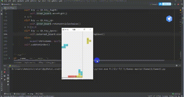 import osimport sysimport randomfrom modules import *from PyQt5.QtGui import *from PyQt5.QtCore import *from PyQt5.QtWidgets import *'''定义俄罗斯方块游戏类'''class TetrisGame(QMainWindow): def __init__(self, parent=None): super(TetrisGame, self).__init__(parent)# 是否暂停ing self.is_paused = False# 是否开始ing self.is_started = False self.initUI()'''界面初始化''' def initUI(self):# icon self.setWindowIcon(QIcon(os.path.join(os.getcwd(), 'resources/icon.jpg')))# 块大小 self.grid_size = 22# 游戏帧率 self.fps = 200 self.timer = QBasicTimer()# 焦点 self.setFocusPolicy(Qt.StrongFocus)# 水平布局 layout_horizontal = QHBoxLayout() self.inner_board = InnerBoard() self.external_board = ExternalBoard(self, self.grid_size, self.inner_board) layout_horizontal.addWidget(self.external_board) self.side_panel = SidePanel(self, self.grid_size, self.inner_board) layout_horizontal.addWidget(self.side_panel) self.status_bar = self.statusBar() self.external_board.score_signal[str].connect(self.status_bar.showMessage) self.start() self.center() self.setWindowTitle('Tetris —— 九歌') self.show() self.setFixedSize(self.external_board.width() + self.side_panel.width(), self.side_panel.height() + self.status_bar.height())'''游戏界面移动到屏幕中间''' def center(self): screen = QDesktopWidget().screenGeometry() size = self.geometry() self.move((screen.width() - size.width()) // 2, (screen.height() - size.height()) // 2)'''更新界面''' def updateWindow(self): self.external_board.updateData() self.side_panel.updateData() self.update()'''开始''' def start(self):if self.is_started:return self.is_started = True self.inner_board.createNewTetris() self.timer.start(self.fps, self)'''暂停/不暂停''' def pause(self):if not self.is_started:return self.is_paused = not self.is_pausedif self.is_paused: self.timer.stop() self.external_board.score_signal.emit('Paused')else: self.timer.start(self.fps, self) self.updateWindow()'''计时器事件''' def timerEvent(self, event):if event.timerId() == self.timer.timerId(): removed_lines = self.inner_board.moveDown() self.external_board.score += removed_lines self.updateWindow()else: super(TetrisGame, self).timerEvent(event)'''按键事件''' def keyPressEvent(self, event):if not self.is_started or self.inner_board.current_tetris == tetrisShape().shape_empty: super(TetrisGame, self).keyPressEvent(event)return key = event.key()# P键暂停if key == Qt.Key_P: self.pause()returnif self.is_paused:return# 向左elif key == Qt.Key_Left: self.inner_board.moveLeft()# 向右elif key == Qt.Key_Right: self.inner_board.moveRight()# 旋转elif key == Qt.Key_Up: self.inner_board.rotateAnticlockwise()# 快速坠落elif key == Qt.Key_Space: self.external_board.score += self.inner_board.dropDown()else: super(TetrisGame, self).keyPressEvent(event) self.updateWindow()'''run'''if __name__ == '__main__': app = QApplication([]) tetris = TetrisGame() sys.exit(app.exec_())