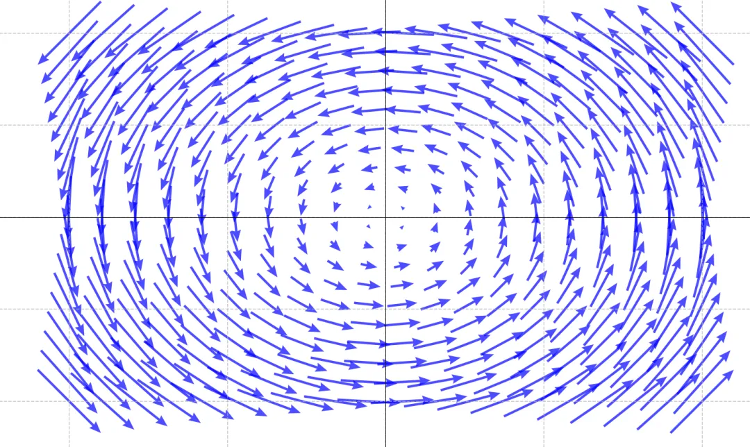 import numpy as npimport matplotlib.pyplot as plt# 创建网格点x = np.linspace(-2, 2, 20)y = np.linspace(-2, 2, 20)X, Y = np.meshgrid(x, y)U = YV = X# 创建图形plt.figure(figsize=(8, 6))plt.quiver(X, Y, U, V, scale=25, pivot='middle', color='red', alpha=0.7)plt.title('Vector Field: $\mathbf{F} = (y, x)$')plt.xlabel('x')plt.ylabel('y')plt.grid(True, linestyle='--', alpha=0.7)plt.axhline(y=0, color='k', linewidth=0.5)plt.axvline(x=0, color='k', linewidth=0.5)plt.xlim(-2.5, 2.5)plt.ylim(-2.5, 2.5)plt.show()