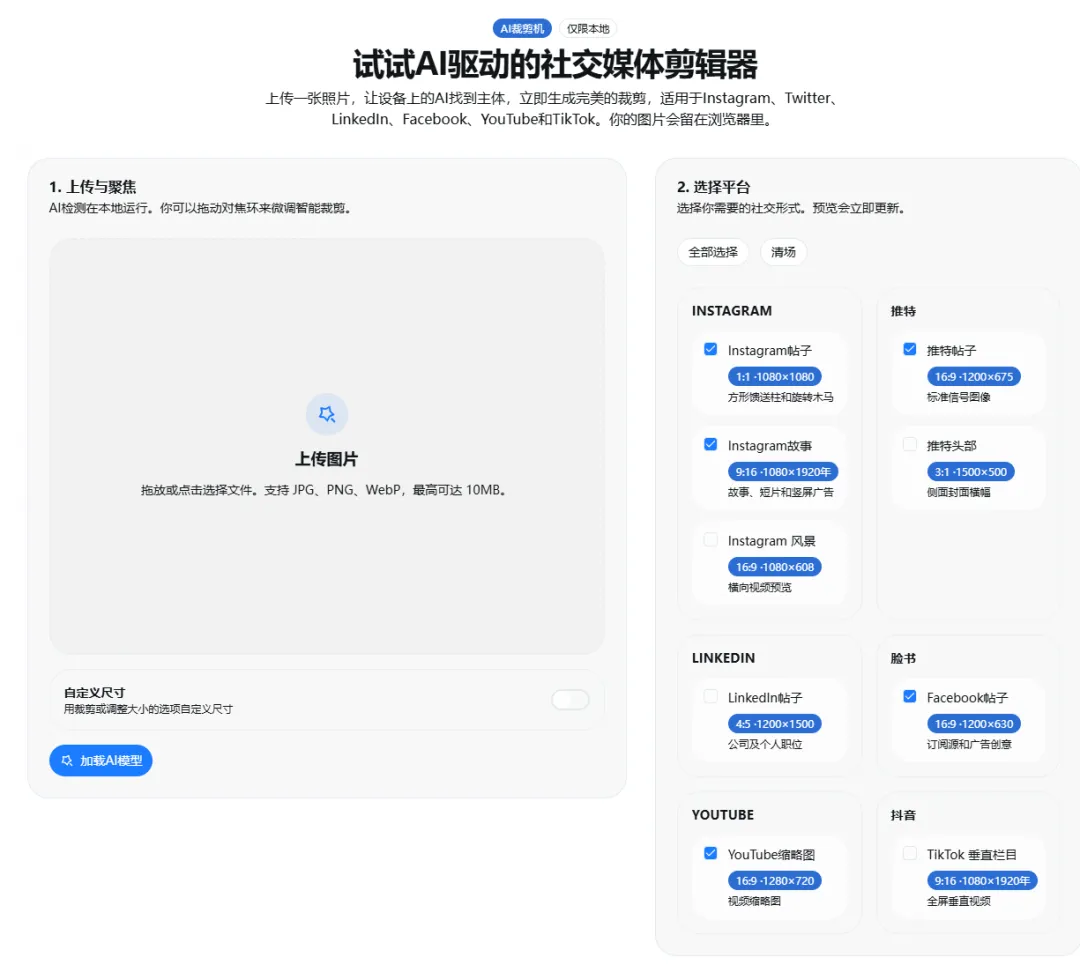 这是一个免费的在线AI图像裁剪工具,只需上传一次图片,便能自动识别图像中的重要主体,并为多个社交平台生成完美的裁剪版本。支持Ins、推、LinkedIn、FB、油管和TK等多个平台,所有处理均在用户的浏览器中进行,确保隐私安全,无需注册或水印 #AI