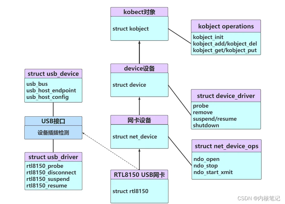 以Linux内核中的RTL8150 USB网卡驱动源码为例:我们把以usb_device为基类的这条继承分支当作一个接口来处理,USB网卡通过usb_device封装的接口可以实现USB网卡设备的插拔检测、底层数据传输等功能。而对于以net_device为基类的这路继承,我们把它看作一个普通的单继承关系,USB网卡以kobject为基类,实现多级继承,每一级的基类都扩展了各自的方法或封装了接口,供其子类RTL8150调用。RTL8150网卡通过调用祖父类kobject的方法kobject_add()将设备注册到系统;通过调用device类的probe()完成驱动和设备的匹配及设备的suspend、shutdown等功能;通过调用net_device类实现的open、xmit、stop等接口完成网络设备的打开、数据发送、数据停止发送等功能。