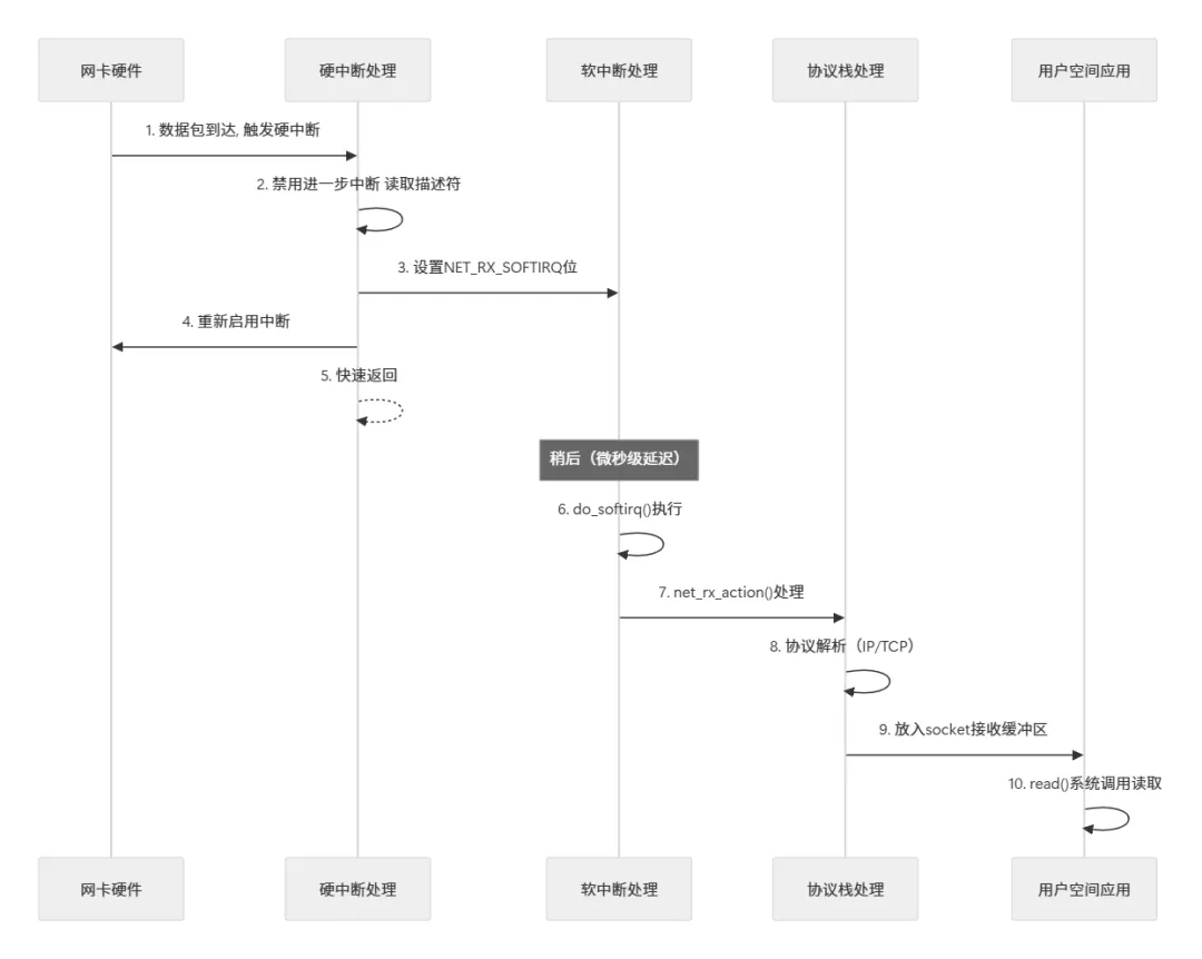 - 1. 分层处理哲学: 硬中断做"最少必要工作", 软中断做"繁重但可延迟的工作"