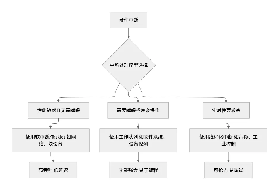 Linux内核采用了著名的**“上半部/下半部”**(Top Half/Bottom Half)中断处理模型: