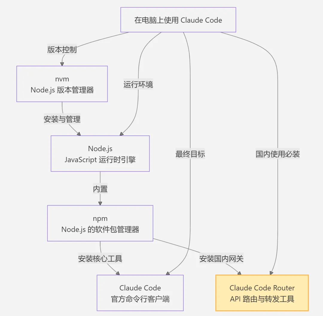 Claude Code 及配套的 Claude Code Router 工具均基于 Node.js 开发。无论是 Windows 还是 Linux 用户,都是围绕 Node.js 安装相关库。