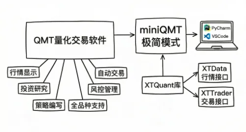 miniQMT是QMT的极简模式,继承了QMT的核心优势,支持外部编辑器(如PyCharm、VSCode等),用户可在本地配置Python环境编写策略代码,通过XTQuant包与QMT客户端连接实现实盘交易,编写相对灵活。其核心是XTQuant库,提供行情(XTData)和交易(XTTrader)接口。