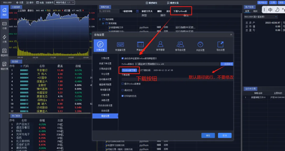 先登录你的 QMT 软件,在主界面正上方中间位置,找到【下载 python 库】按钮点进去下载 python 库,等着下载完成就行,注意别改 Python 库路径,就用默认的。