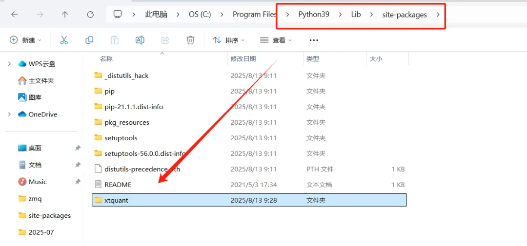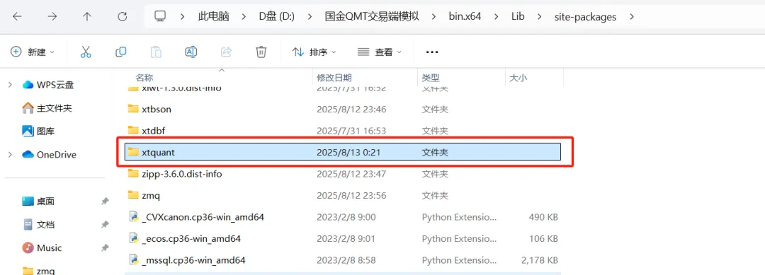 下载好之后,xtquant 库就到了你 QMT 的内置 Python 环境里。xtquant 包在 QMT 安装目录 bin.x64\Lib\site-packages 下