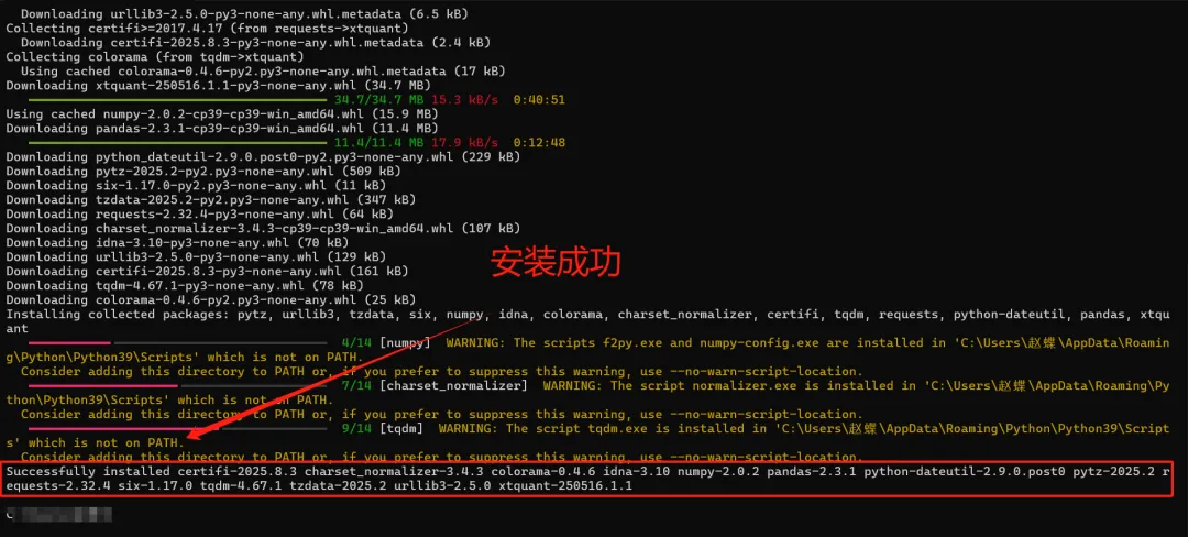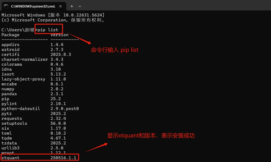 验证一下:在命令行里输入 pip list 看到xtquant的版本就说明安装成功。