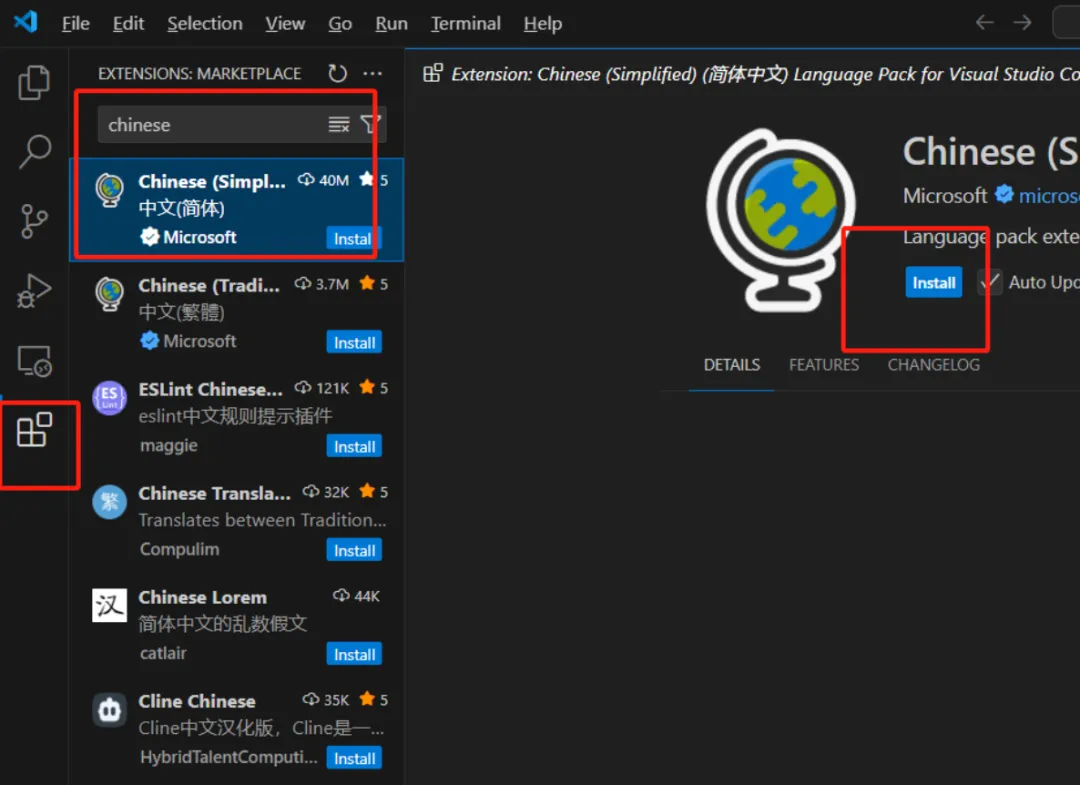 首先需要在 VScode 里搜索并安装中文语言包,很简单,按提示操作就行。