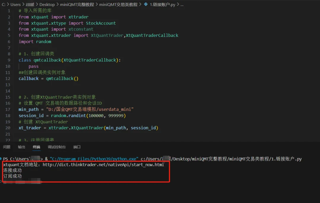 VScode链接miniQMT时,一定要保持miniQMT登录,运行链接账户的代码,显示链接、订阅成功,VScode 就和 miniQMT 成功链接上了,之后你就能利用 VScode 强大的代码编辑功能,结合 miniQMT 的量化交易优势,高效地开发和运行量化交易策略啦 !