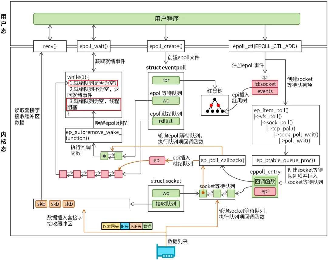 数据到来时,数据经网卡->网络设备子系统->网络协议栈,最后存储至套接字接收缓冲区。一旦数据被套接字接收,则epoll读事件就绪。内核会轮询socket等待队列,并执行ep_poll_callback回调函数,该函数有两个作用: