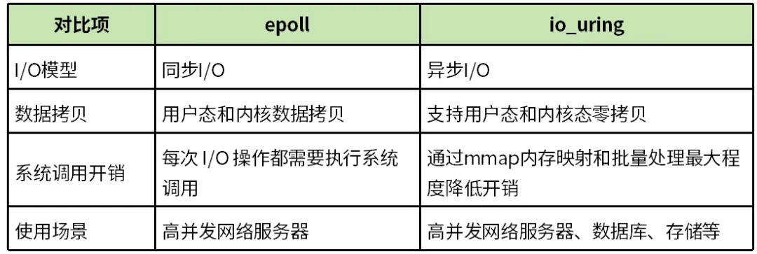 最后,我们同样来看一下io_uring有哪些优缺点。- 用户程序和内核共享内存:SQ/CQ通过mmap映射,避免传统read/write的多次数据拷贝。