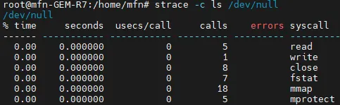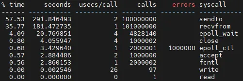 执行strace -c ./tcp_epoll 192.168.2.2 9999命令统计epoll服务端系统调用情况,统计结果如下: