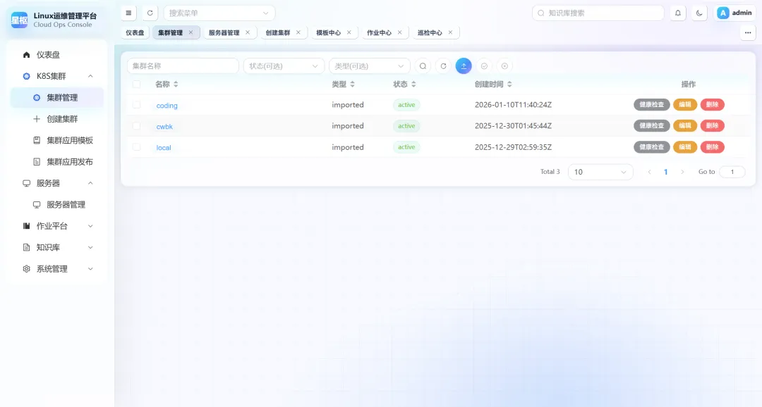 - 2. 基础运维操作全覆盖成功纳管的集群会统一展示在集群管理列表,支持健康检查、编辑、删除等基础操作,集群的名称、类型、状态、创建时间等信息一目了然,方便运维人员快速掌握集群基础情况。