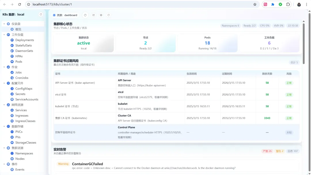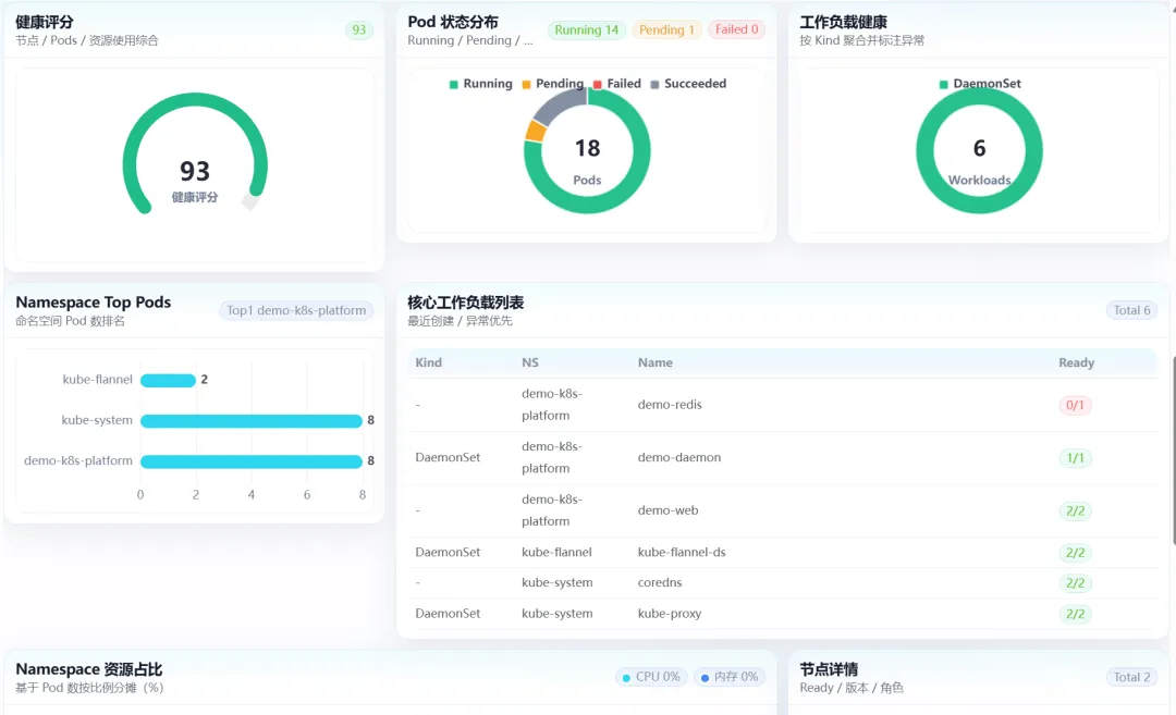 集群概览页面整合了核心运行数据,包括Namespaces数量、节点就绪状态、CPU/内存使用率、Pod运行状态等。