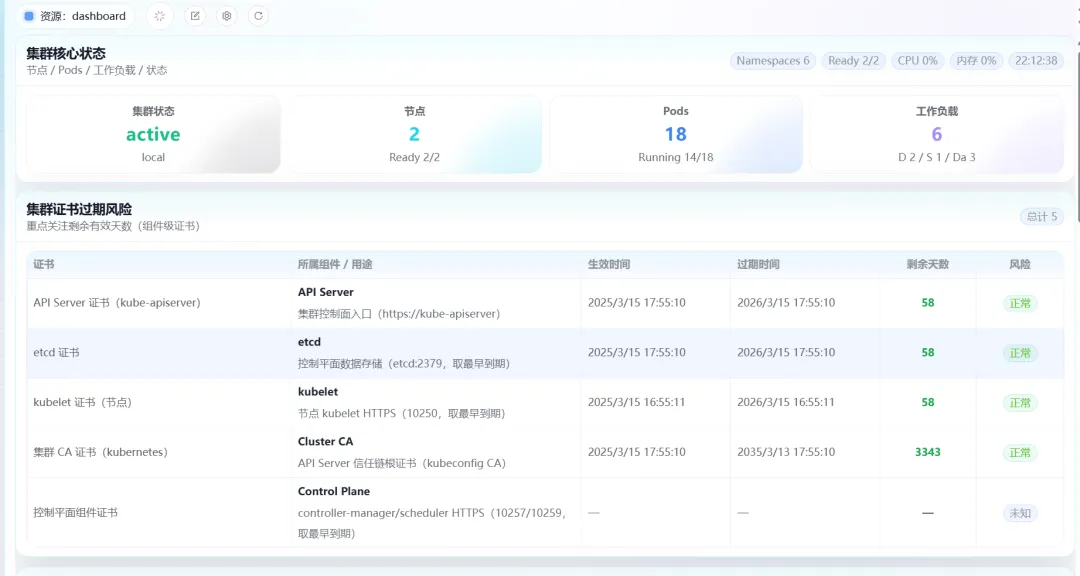 同时,平台还支持集群证书过期风险预警,清晰展示API Server、etcd、kubelet等核心组件证书的生效时间、过期时间、剩余天数及风险状态,帮助运维人员提前规避证书过期引发的集群故障。