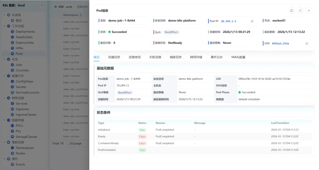 - • Pod详情:提供概览、容器信息、资源使用、关联资源、调度信息、网络存储、事件日志、YAML配置等8大维度信息,全方位掌握Pod运行状态