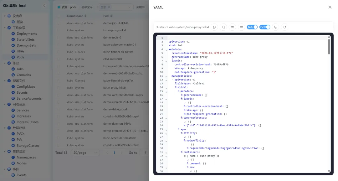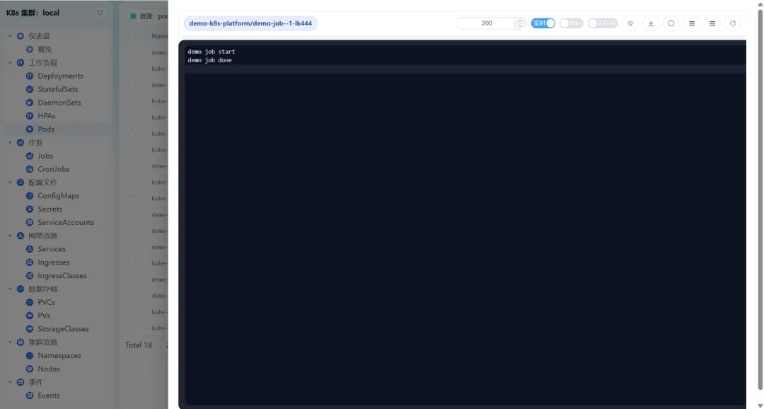 - • Pod日志:支持实时刷新、换行显示、行号标注、颜色主题切换,还能一键下载日志文件,问题排查更高效