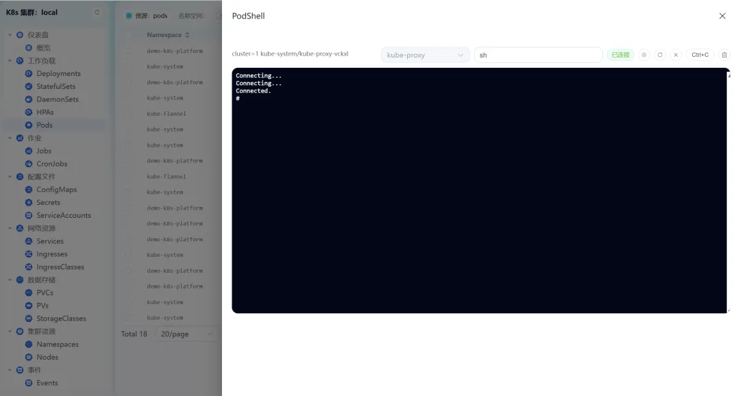 - • Pod Shell:支持一键连接Pod容器终端,直接执行命令操作