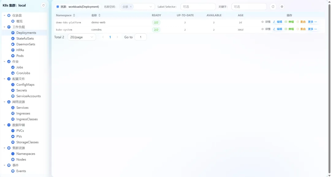 工作负载是K8S集群管理的核心,平台对Deployments、StatefulSets、DaemonSets、Pods等核心资源提供了精细化操作能力。