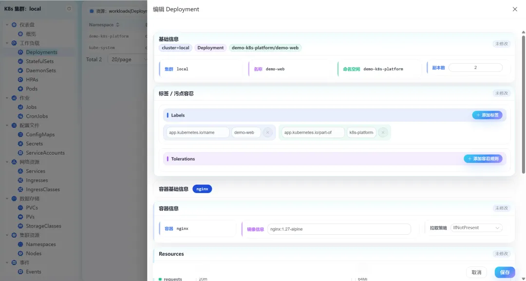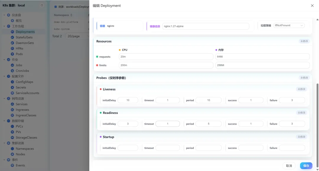 针对Deployments资源,平台支持常用配置可视化编辑,包括副本数调整、标签/污点容忍规则设置、镜像信息修改、CPU/内存资源限制调整,以及存活探针、就绪探针参数配置,无需手动编写YAML,降低运维门槛。