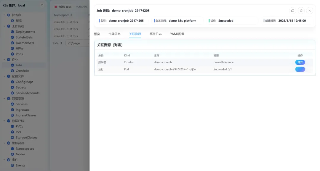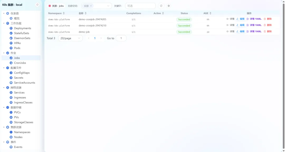 - • 作业管理:支持Jobs、CronJobs的详情查看、编辑、YAML配置查看及删除操作,作业的完成状态、运行时长一目了然