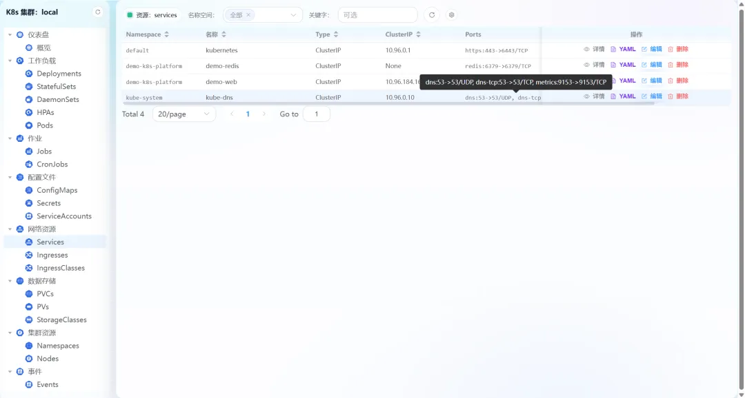 - • 网络资源管理:支持Services资源的全量展示,涵盖命名空间、名称、类型、ClusterIP、端口映射等关键信息,支持编辑、删除操作