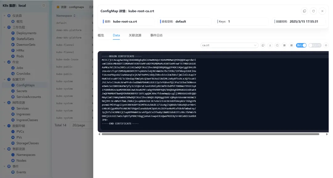 - • 配置文件管理:支持ConfigMaps资源的详情查看,清晰展示配置内容,方便运维人员快速获取配置信息