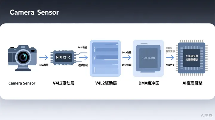 Camera Sensor → MIPI CSI-2 → V4L2驱动层 → DMA缓冲区 → AI推理引擎