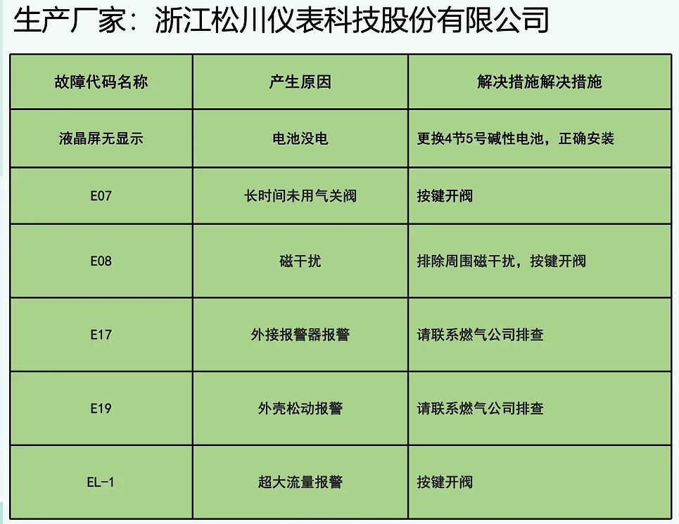 快速识别解决燃气表故障代码(厂商:浙江松川)