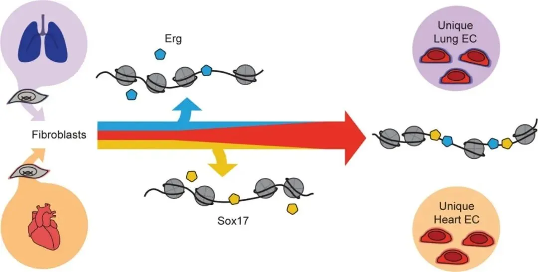 图示:在重编程成纤维细胞中,Sox17和Erg的共表达可以有效激活内皮特性