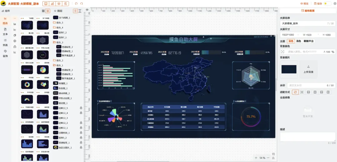 自助大屏设计器:支持动画、联动、动态显隐、ECharts集成。