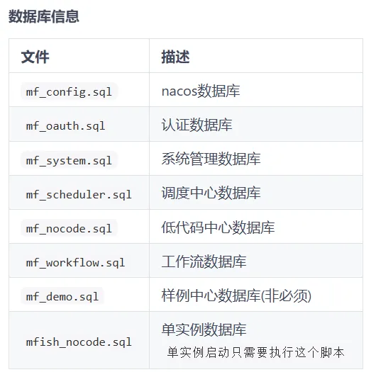 如果单实例使用只需要导入mfish_nocode.sql库即可如果使用微服务需要导入mf_config.sql、mf_oauth.sql、mf_system.sql、mf_scheduler.sql、mf_nocode.sql、mf_workflow.sql、mf_demo.sql等数据库。