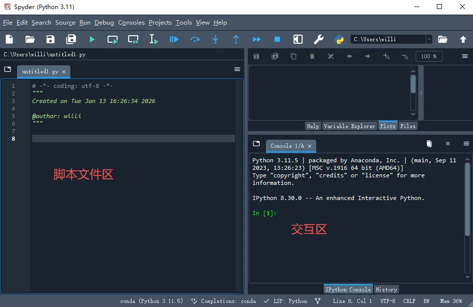 上文介绍的两种运行模式是各自独立的,频发切换在命令提示符窗口,很是麻烦。这里,推荐大家使用Spyder软件,它可以将脚本文件模式和交互模式融合,并具有两种模式的有点,开发效率更高,还是免费的(通常集成在Anaconda软件包中,即安装完Anaconda后,电脑上就有了)。如下: