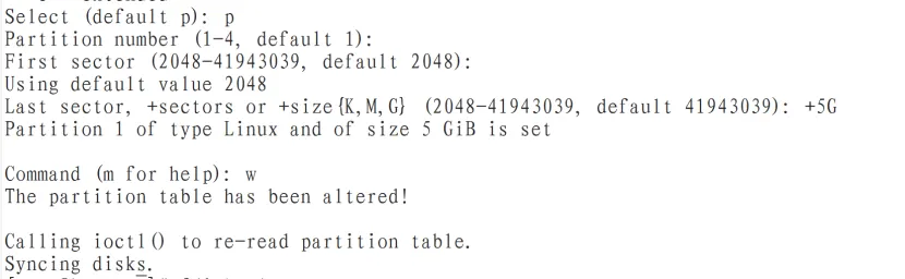 2.6Last sector, +sectors or +size{K,M,G} (2048-41943039, default 41943039): +5G(分配大小)
