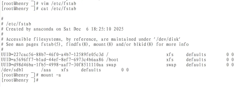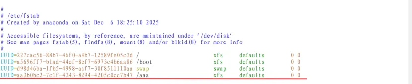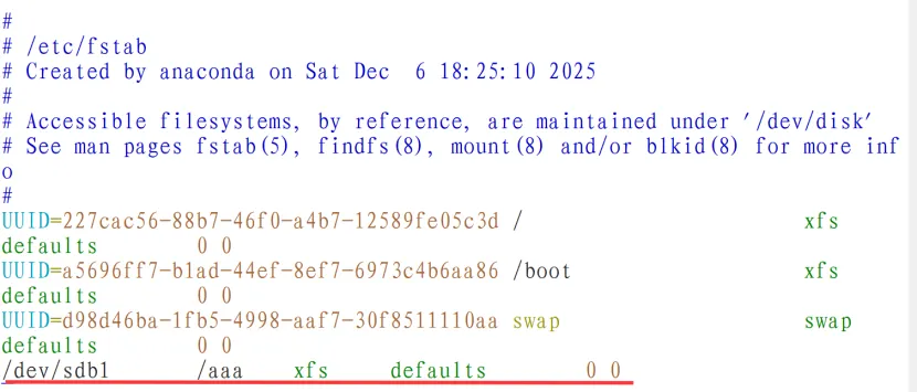 但是当重启之后,会发现aaa目录不见了,需要重新手工挂载。如果想要永久挂载则需要执行下面操作: