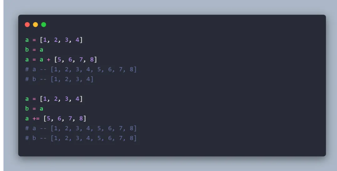 注:a = a + [5,6,7,8] 创建了一个新列表,a += [5,6,7,8] 扩展了原列表。