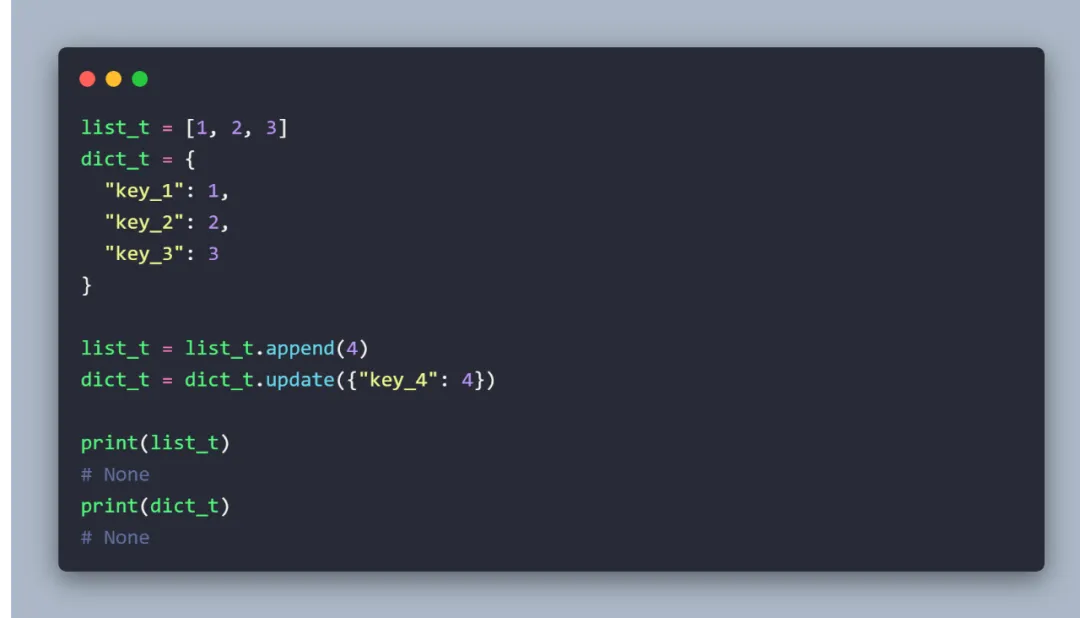 注:列表、字典的更新都是就地修改对象并返回None,以提高性能。