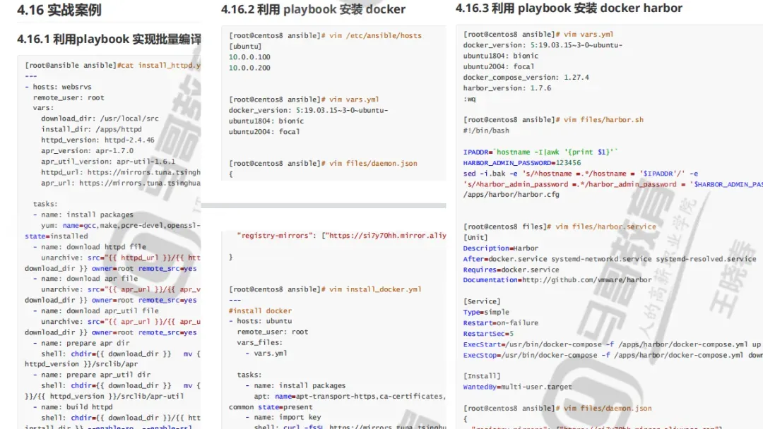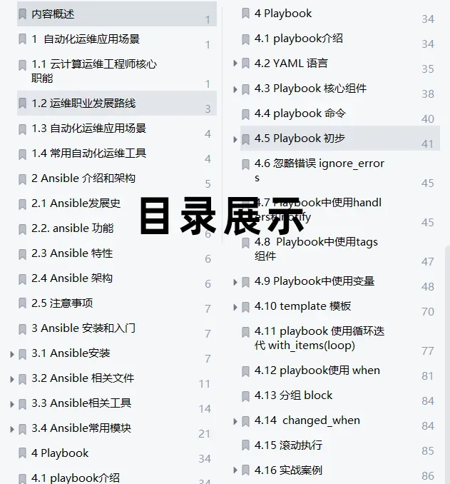在这个Playbook中,我们首先安装firewalld,然后启动它,接着打开80和22端口。最后,你可以运行这个Playbook,应用到你的服务器上。你可以使用下面的命令:ansible-playbook -i hosts.ini playbook.yml。再给大家分享一份 Ansible 学习资料合集。内容详实,包含详尽的ansible思维导图3张,ansible中文手册45页,ansible面试题17道,还有91页轻松玩转ansible实现企业级自动运维!轻松玩转ansible实现企业级自动运维——目录