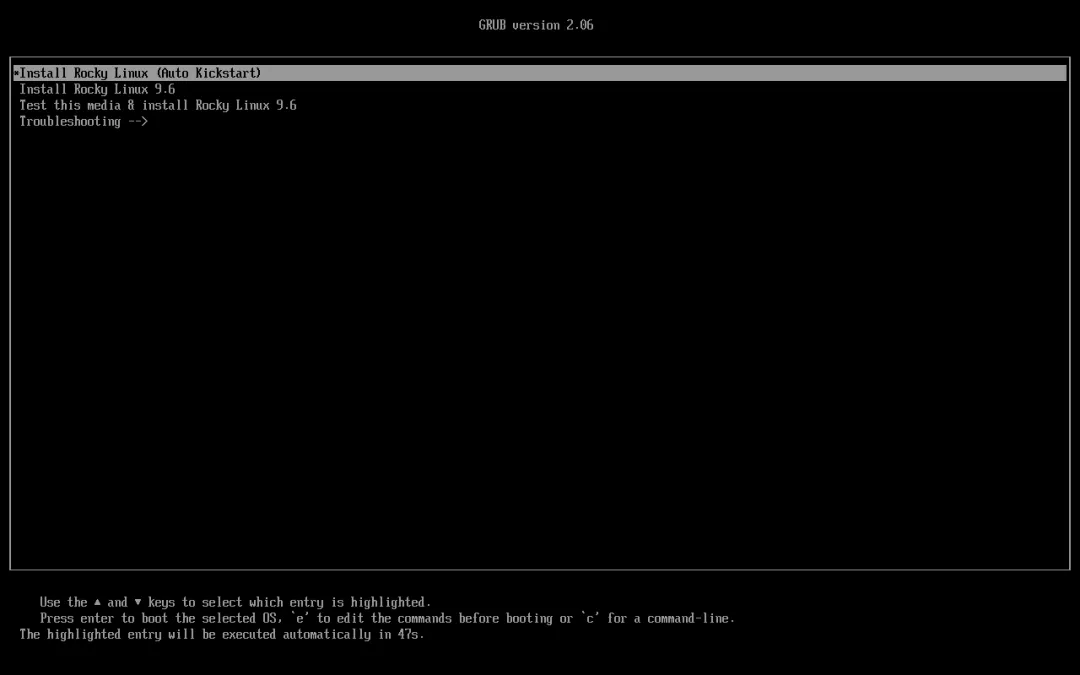 label linux menu label ^Install Rocky Linux 9.6 menu default kernel vmlinuz append initrd=initrd.img inst.stage2=hd:LABEL=Rocky-9-6-x86_64-dvd quiet