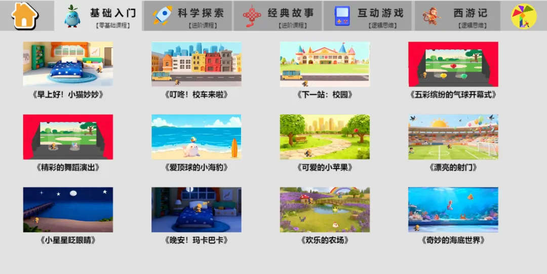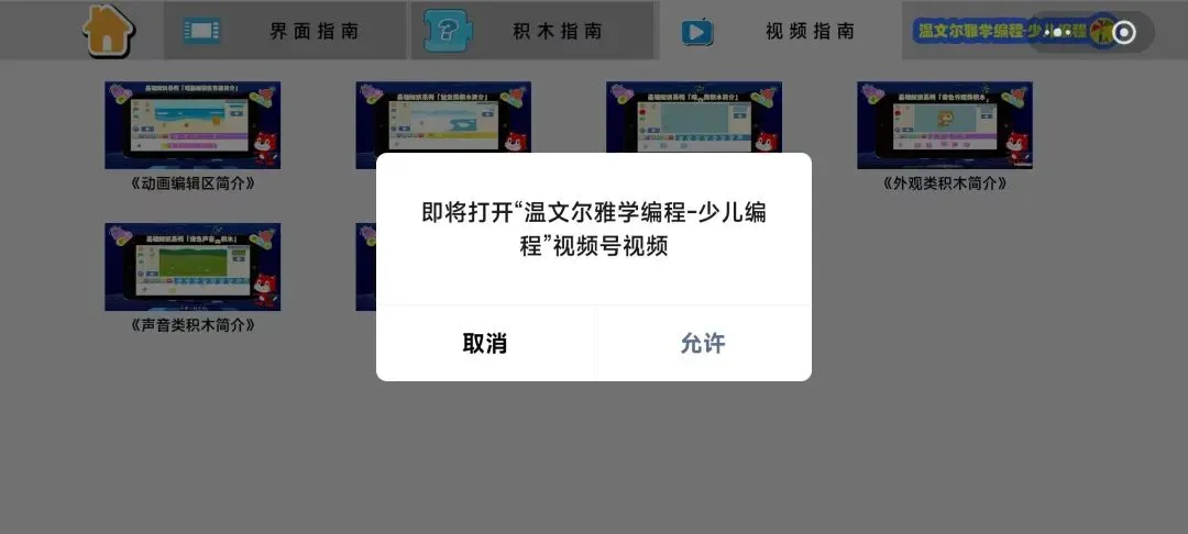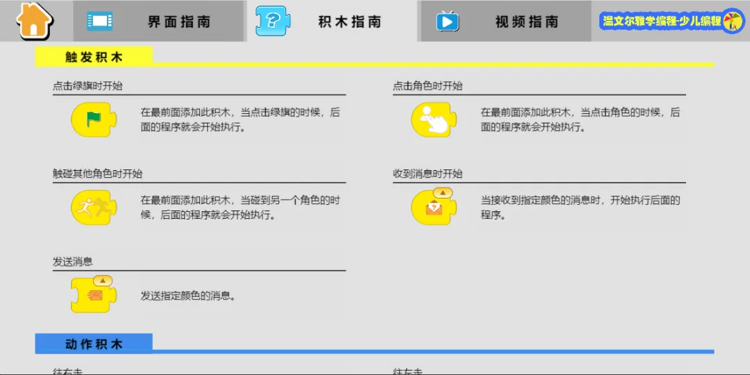 担心孩子不会用?编程指南板块贴心提供全方位指引,从界面操作到积木使用,层层递进帮孩子扫清障碍:界面指南:界面上的每个字母都对应专属功能,点击任意字母,右侧面板会即时弹出详细介绍,直观易懂,让孩子快速熟悉软件布局。积木指南:编程核心的积木模块按颜色分类,手指上下滑动即可查看不同颜色积木的具体作用,帮孩子建立积木使用逻辑,为编程入门打基础。视频指南:以趣味视频教学的形式,详细讲解编程界面操作及各类积木的使用方法,画面生动、讲解通俗,孩子跟着学就能掌握核心技巧。点击对应图片弹出播放窗口,确认允许后即可观看视频,全程无广告干扰,专注教学引导。🎓 开启编程:五大课程体系,覆盖多元兴趣