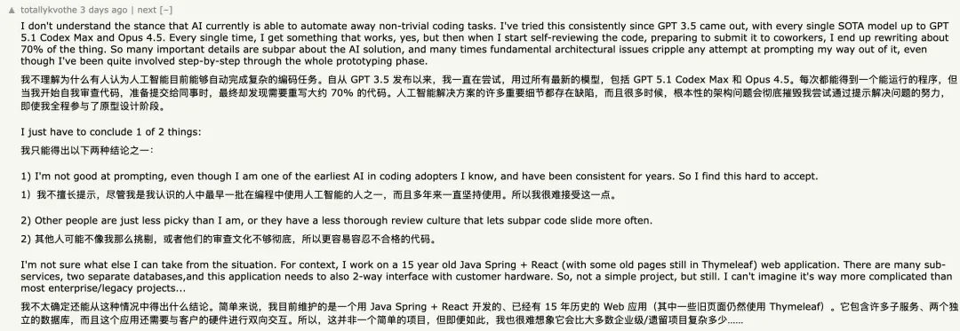 在 Hacker News 上,这篇文章引发了长时间讨论。一些开发者指出,目前的 AI 在复杂系统设计、长期维护和边界条件处理上依然存在明显不足。