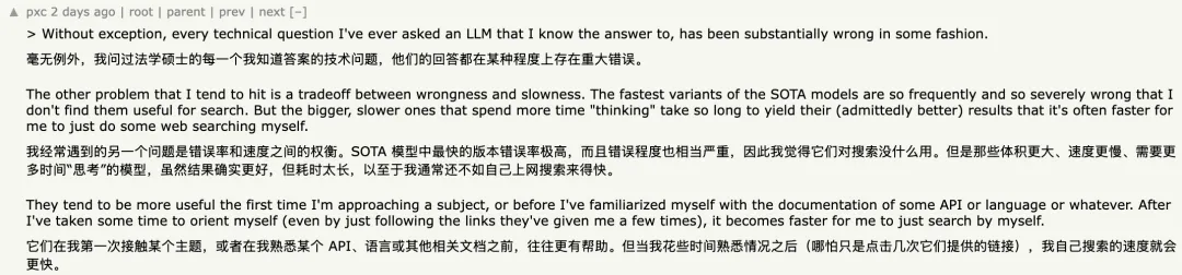 在我刚开始接触某个新领域,或者还没完全熟悉某个 API、语言或相关文档之前,这些模型确实能发挥一定作用。但一旦我花了些时间完成“入门”,哪怕只是顺着它们给出的链接自己看过几次资料,后续再查问题时,直接自己搜索反而更高效。”