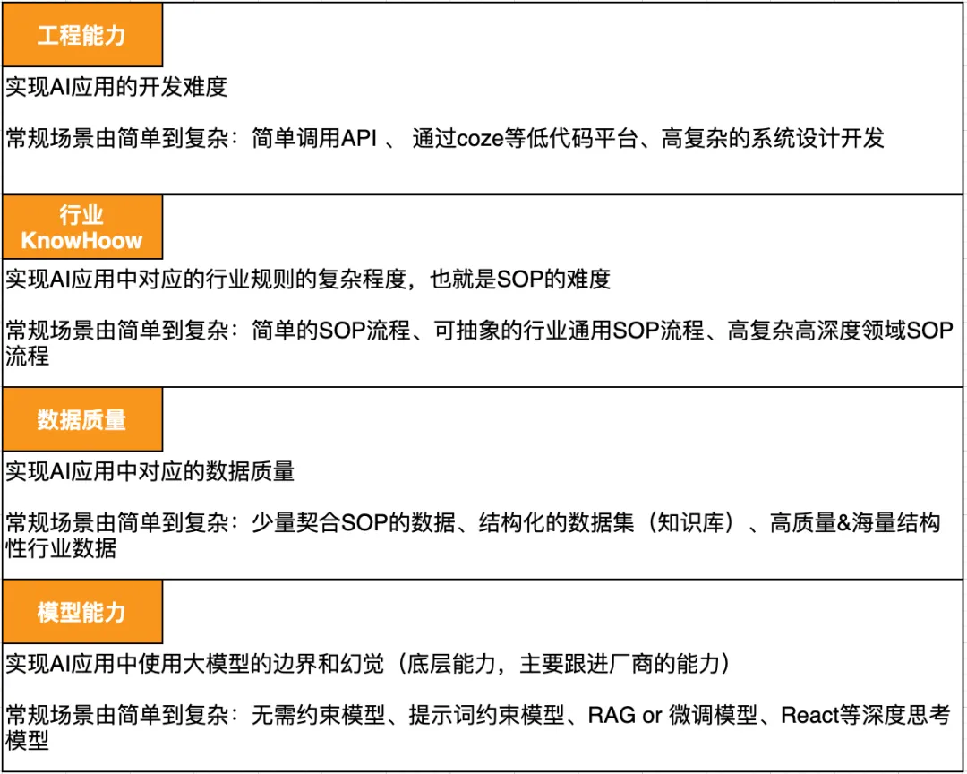 在开发 AI 应用时,我们通常面临四个维度的挑战:模型能力、工程难度、数据质量、行业 Know-How。其中,“行业 Know-How”的 SOP 化是最难标准化的环节。
