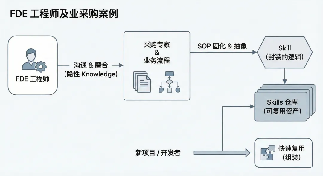 当 FDE 完成了一次特定场景的 SOP 固化(例如:供应链中的“供应商资质审查”),他现在可以将其封装为一个标准的 Skill。