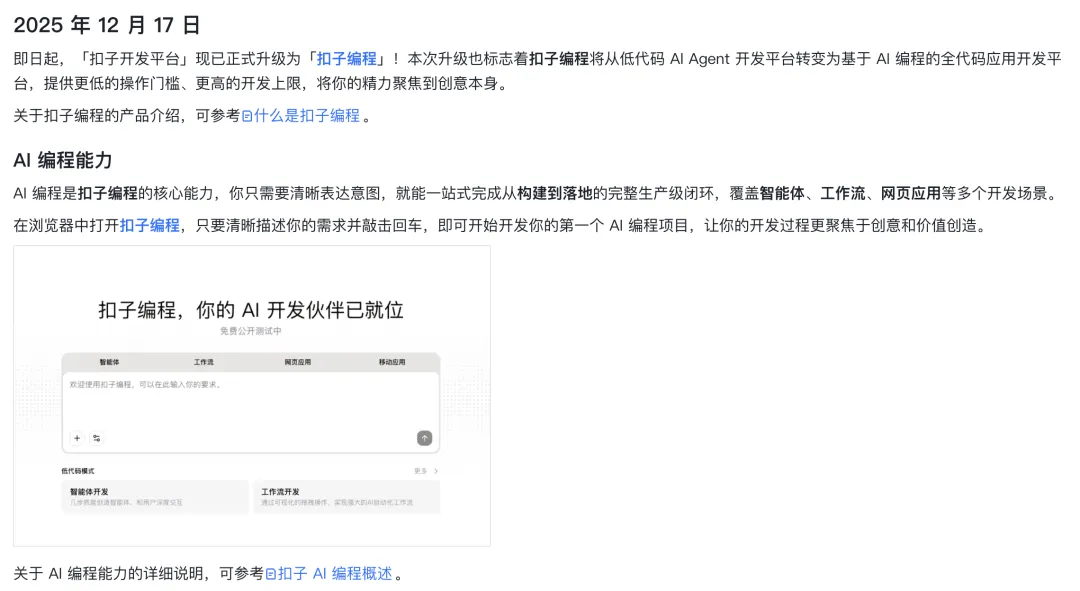 - Coze (扣子编程):其核心演进方向是将 Workflow 封装为 Tool。通过对话流的方式,用户不再需要手动的拖拽节点编排逻辑,而是像对话一样阐述SOP过程,很好的降低了用户完成SOP业务流程的成本。下图是Coze官网的产品演进路线。