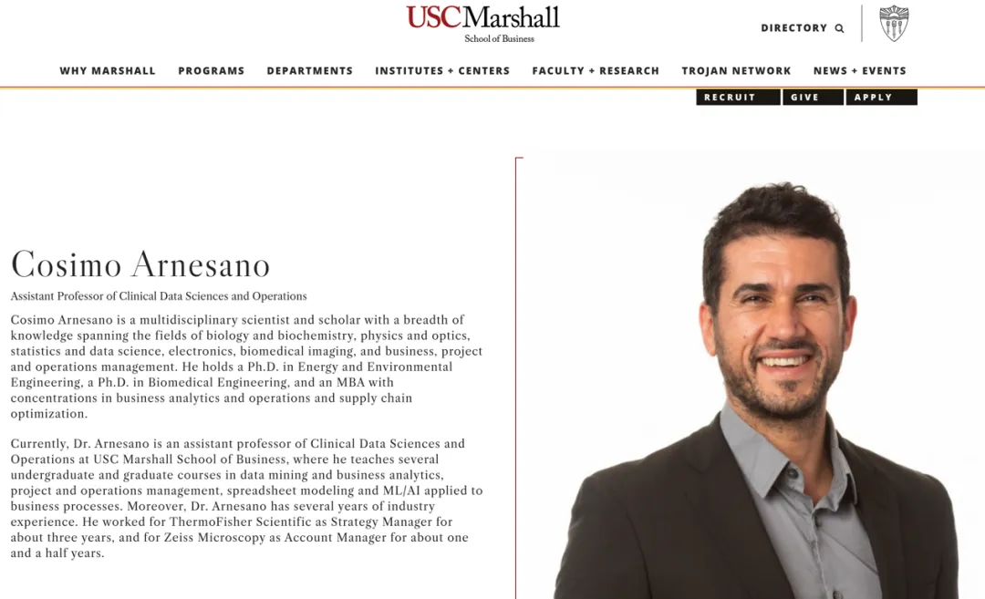 自2013年加入南加州大学以来,Arnesano教授的研究与教学路径也体现了跨学科融合的特点。他最初从事生物医学工程研究,随后转向商科领域,如今在马歇尔商学院讲授运营管理、数据科学等本科与研究生课程。其早年在工程与医学领域的学术积累,为他在商科教学、特别是数据科学方向提供了扎实的理论支撑。