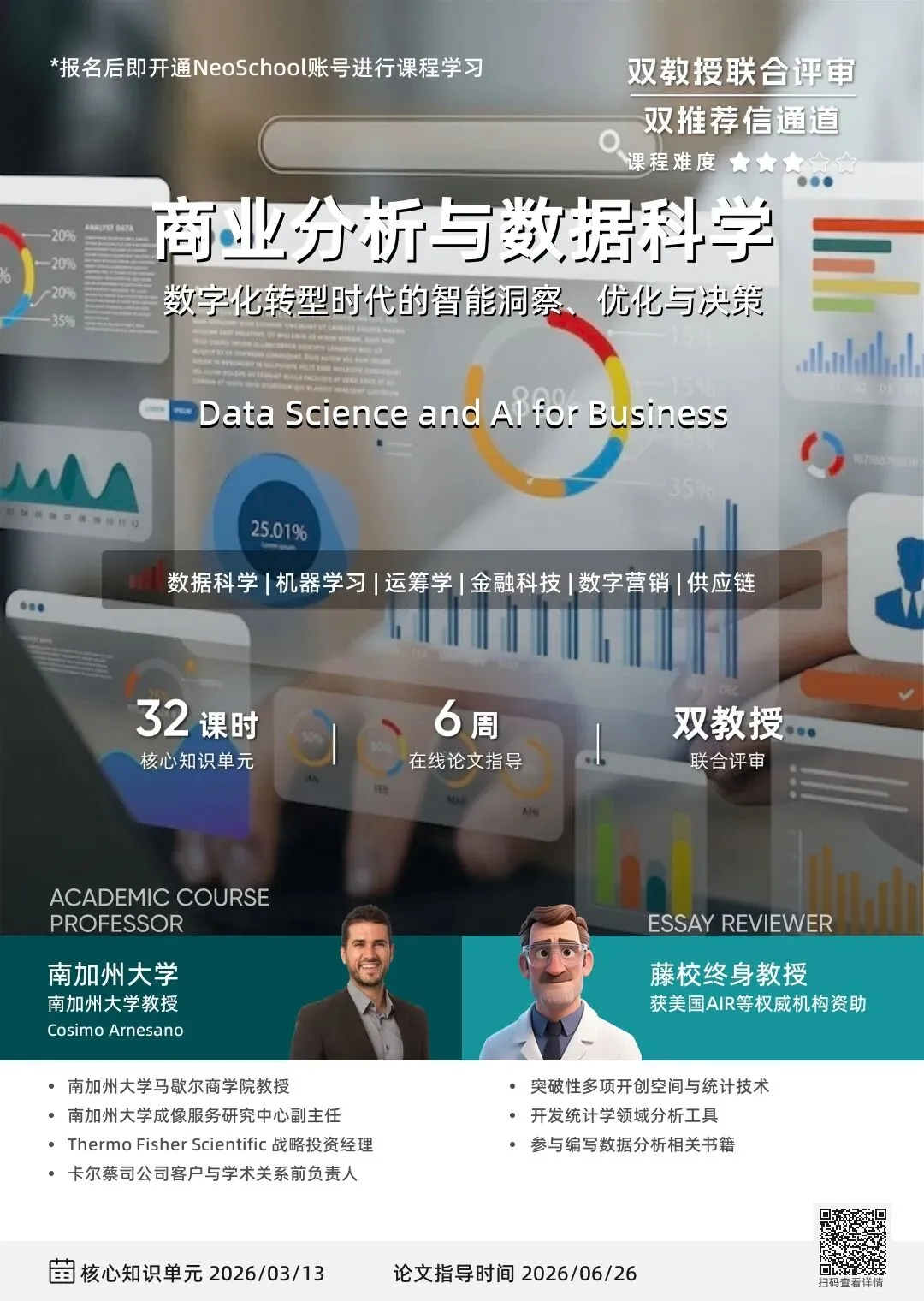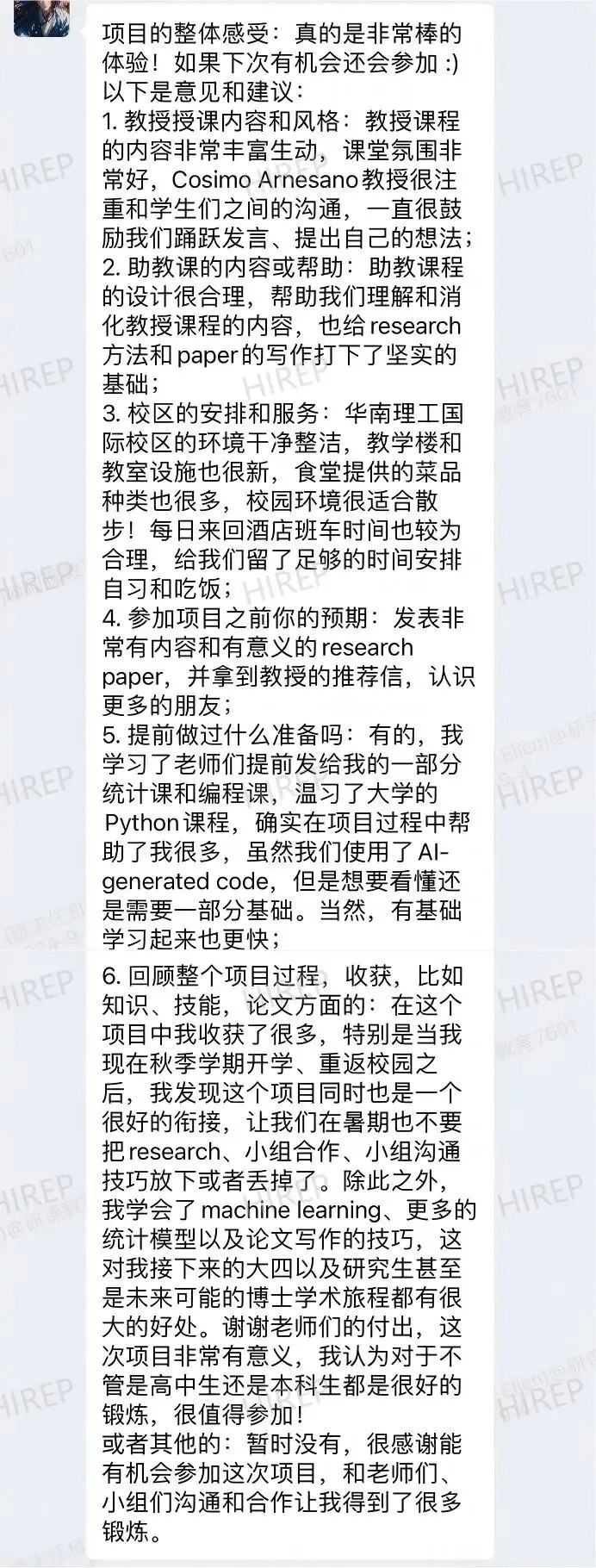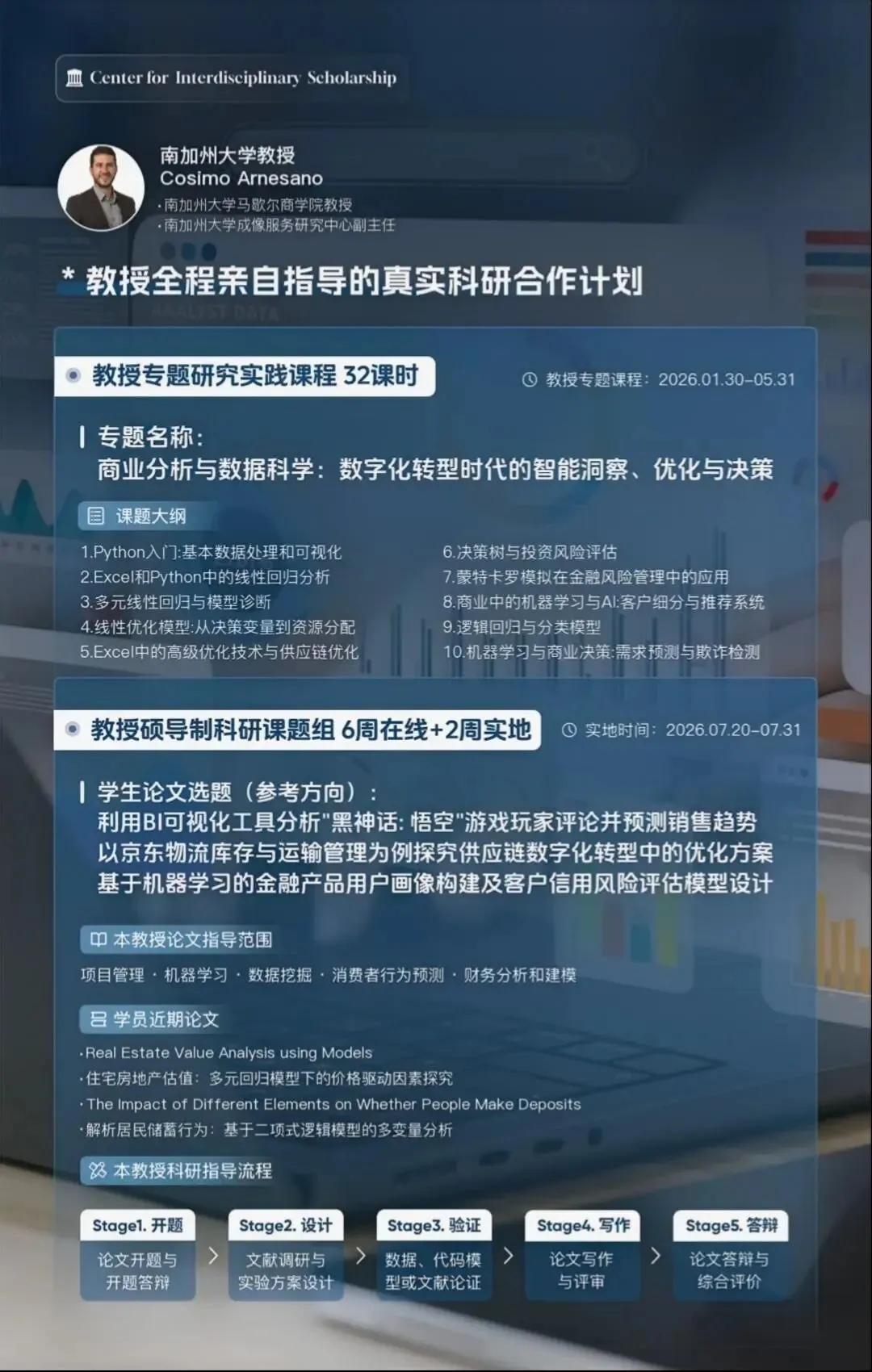 正是这种跨越工程、医学与商学的复合背景,使他在课程设计与学术指导方面更具优势。他在HIREP开设的商业分析课程,注重融合多学科知识与实际商业应用;在论文指导方面,则聚焦于项目管理、机器学习等前沿方向,为学生提供多角度的学术支持。